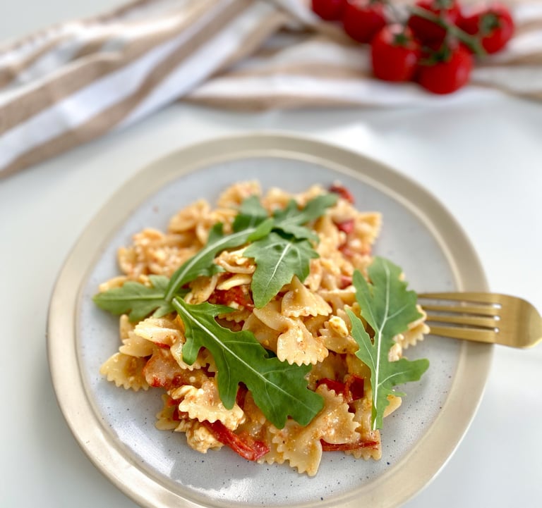 Ištraukus iš orkaitės pomidoriukus ir fetos sūrį, šakute viską sutriname iki vientisos masės. Į gautą padažą beriame makaronus ir viską gerai išmaišome.